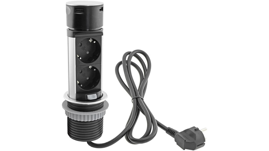 Kompakte versenkbare 2-fach Steckdose fü,r den Einbau in Schreibtisch, Werkstatt-Tisch oder Arbeitsplatte mit 2 zusä,tzlichen USB Ladebuchsen