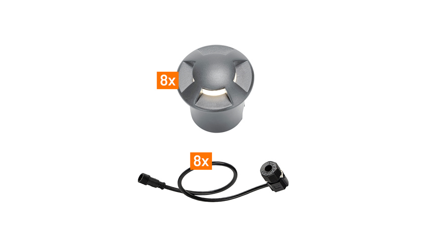 Das Erweiterungsset 24V-Garten Aluminium LED Bodenleuchte ergänzt Ihr bestehendes Beleuchtungssystem um acht hochwertige Bodeneinbauleuchten. Mit warmweißem Licht und langen Anschlusskabeln eignet sich das Set ideal für flexible Lichtführung entlang von Wegen, Terrassen und Einfahrten.