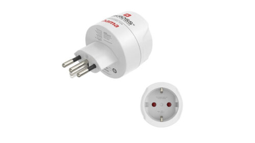 Dieser kompakte Reisestecker (10 A/250 V) ermöglicht den Anschluss von Elektrogeräten in Ländern mit Schweizer, italienischem und brasilianischem Steckdosensystem. Er ist ideal für Reisende aus Europa und kommt in einem weißen Design-Gehäuse.