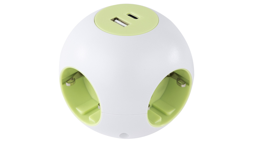 Zweifarbige Kugelsteckdose für bis zu 4 elektrische Geräte. Mit 1,4m Zuleitung, Mit zwei USB Anschlüssen (Typ A und C).