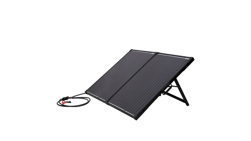 Laden Sie 12-V-Batterien in Auto, Wohnmobil, Gartenhaus und anderen Orten umweltfreundlich mit Solarstrom auf. Der 100-W-Solarkoffer mit zusammenklappbarem Solarmodul und 10-A-Laderegler lädt Blei-Säure- und Lithium-Batterien.