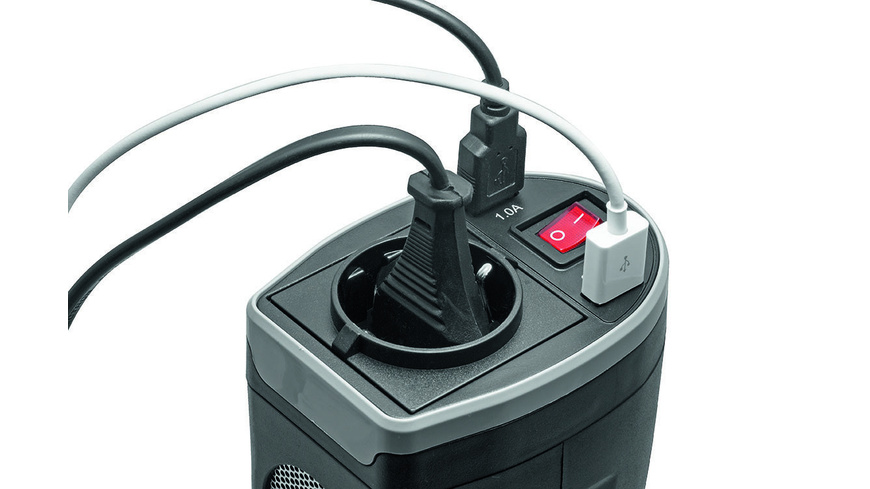 Spannungswandler mit modifizierter Sinuswelle für den Betrieb von Elektrogeräten mit 230 V Netzspannung über das 12-V-DC-Bordnetz.