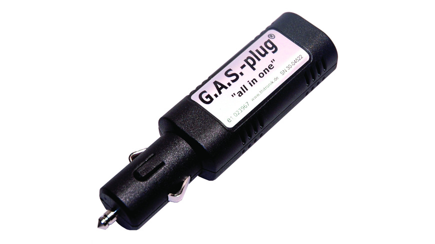 G.A.S.-plug „all in one“ ist ein mobiler und kompakter Gaswarner für den Zigarettenanzünder. Er warnt Sie zuverlässig vor ausströmendem Gas (Betäubungsgase, Propan und Butan), wenn es darauf ankommt.