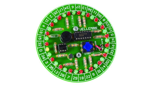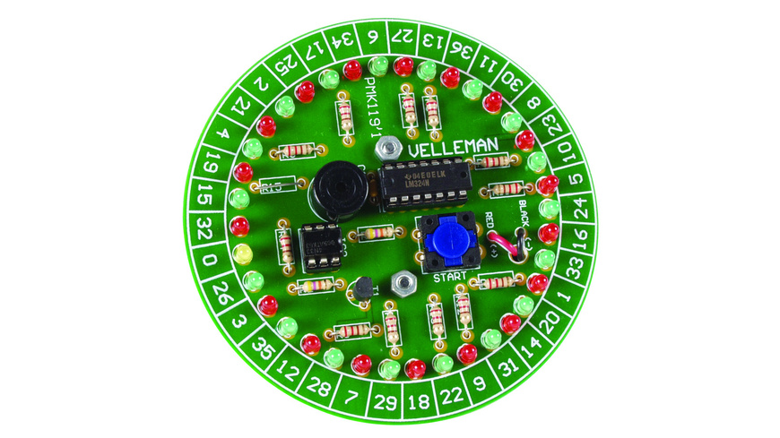 Hier wird keine Kugel geworfen, ein Knopfdruck setzt den LED-Kreisel in Gang, begleitet von Toneffekten für das „Drehen” und den „Gewinn”. Das elektronische Mini-Roulette für den großen Spielspaß!